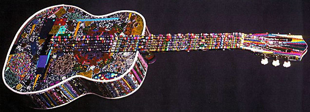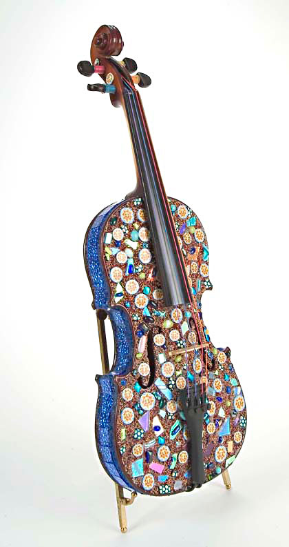 Instruments offer a challenging number areas with both flat and curved planes. Surface types include metal, wood, plastic and even stretched animal hides. So far the embellished instruments include two violins,an acoustic guitar and an electric bass guitar, an antique tenor banjo, an accordion and two smaller guitars. Other pieces include lamps, a Radio Flyer Wagon, shadowboxes with masks,a head full of beaded pins, and clocks and birdhouses.